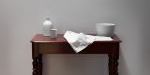 2011, Sampler: wood, linen, embroidery thread, Fly Towel: linen, coton a broder, Cup, Bowl and Bottle: porcelain, matt white glaze, banded iron oxide, Table: cedar
