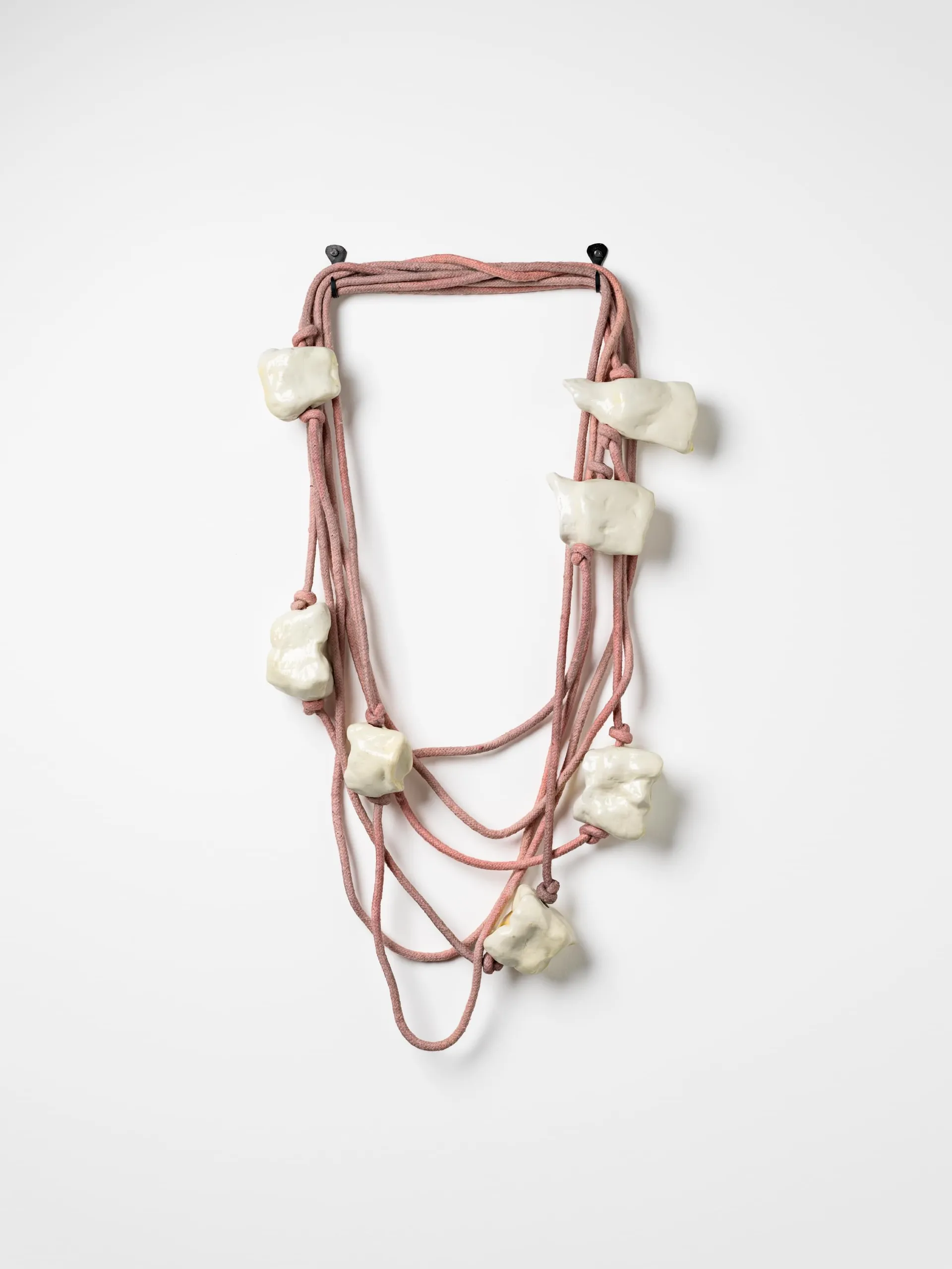 Hand dyed rope and string, modelling clay, varnish, hooks