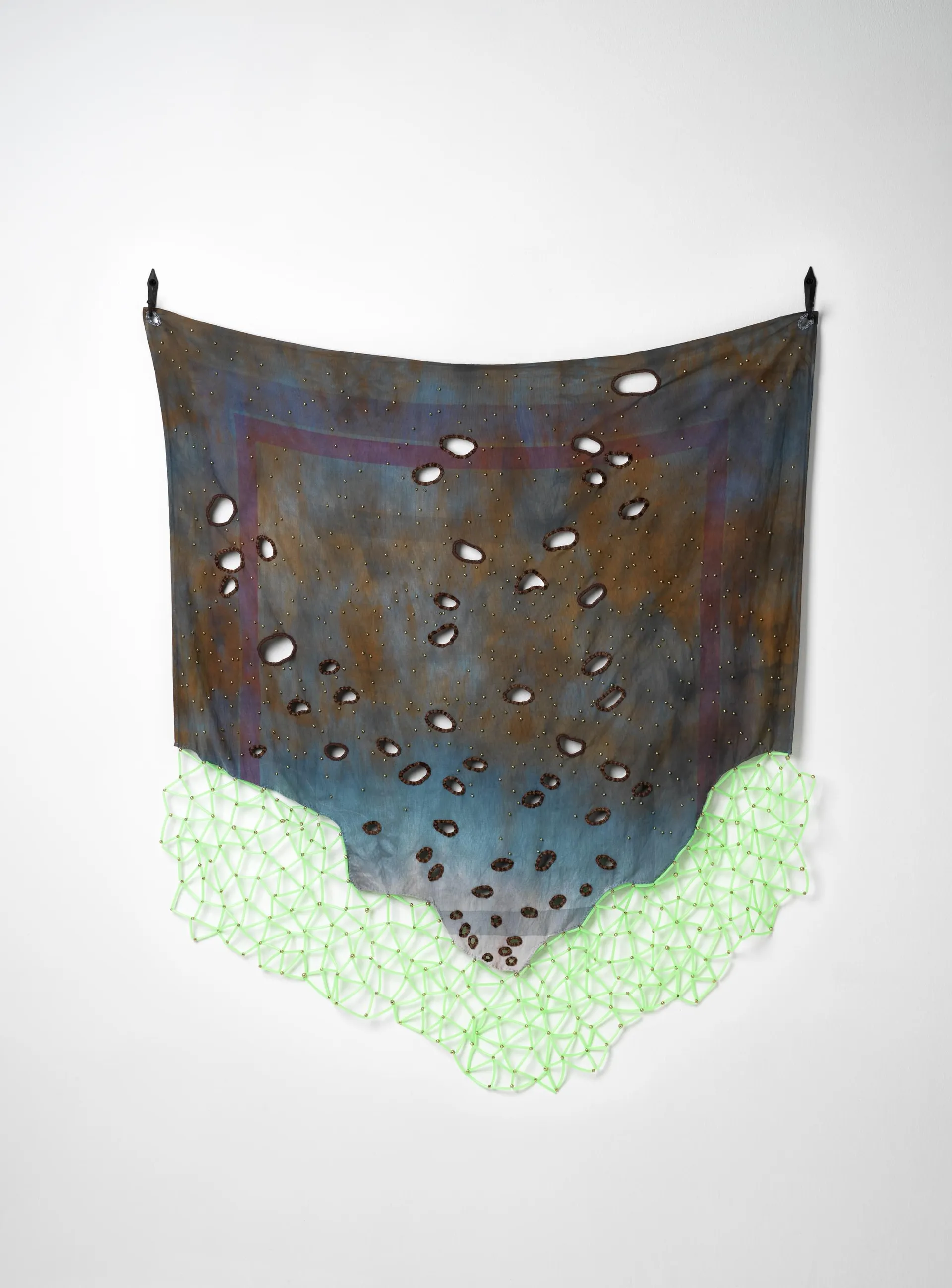 Hand-dyed linen, cotton, beads, glow-in-the-dark tubing
