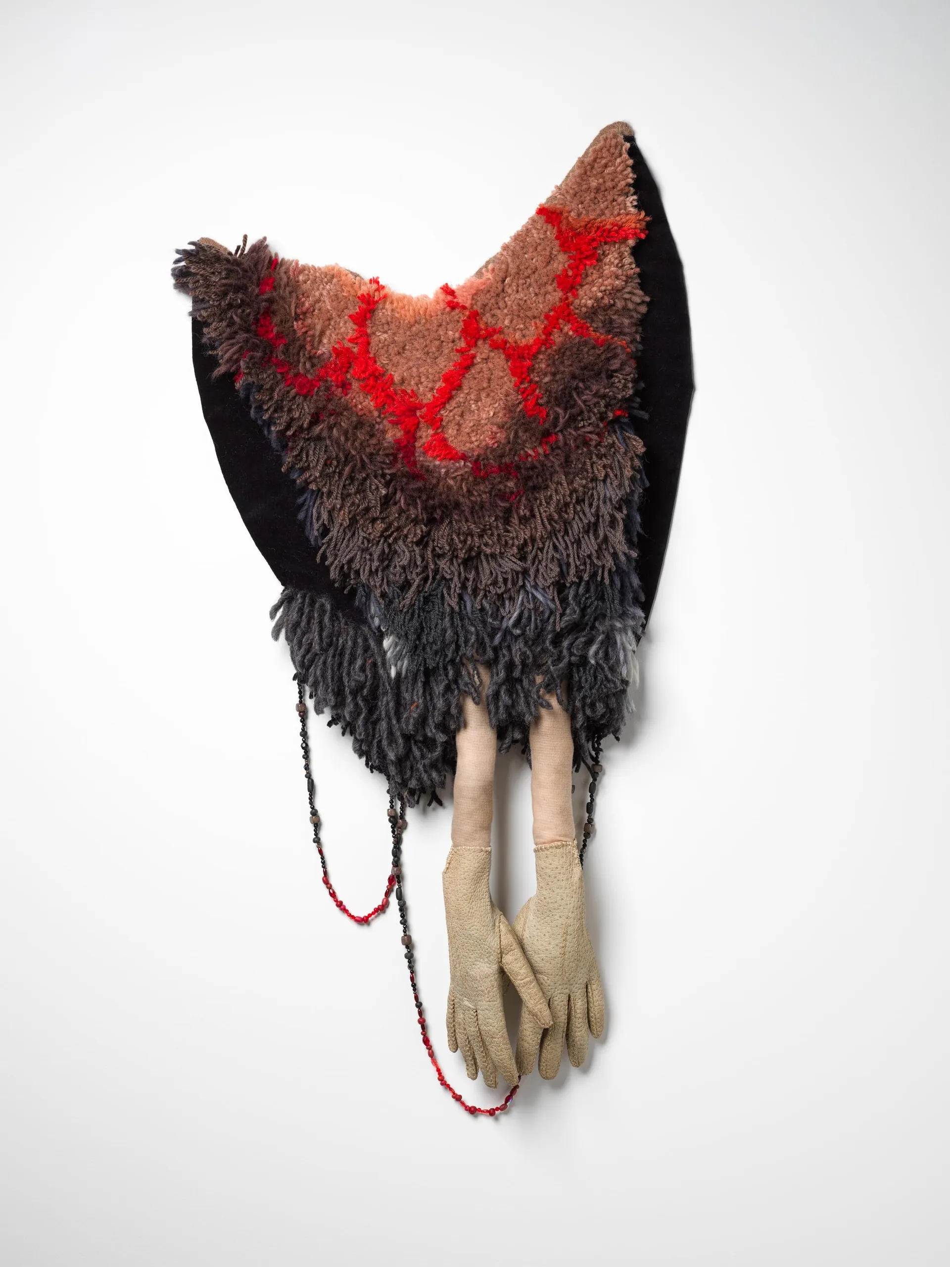 Various repurposed wools, found and handmade beads, leather gloves, linen, stuffing