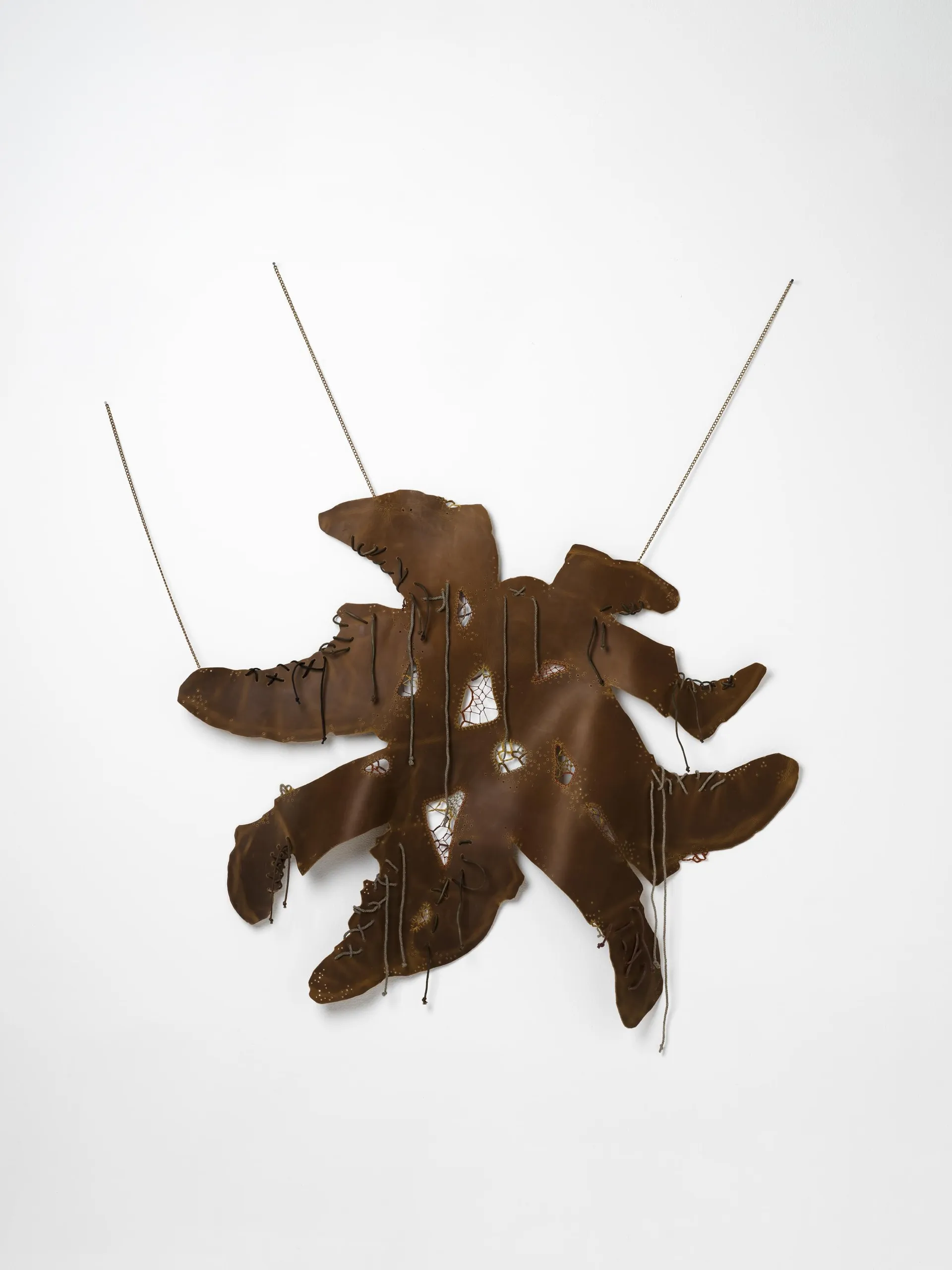 Leather, cotton and various threads, chain, hand-dyed shoelaces, rope