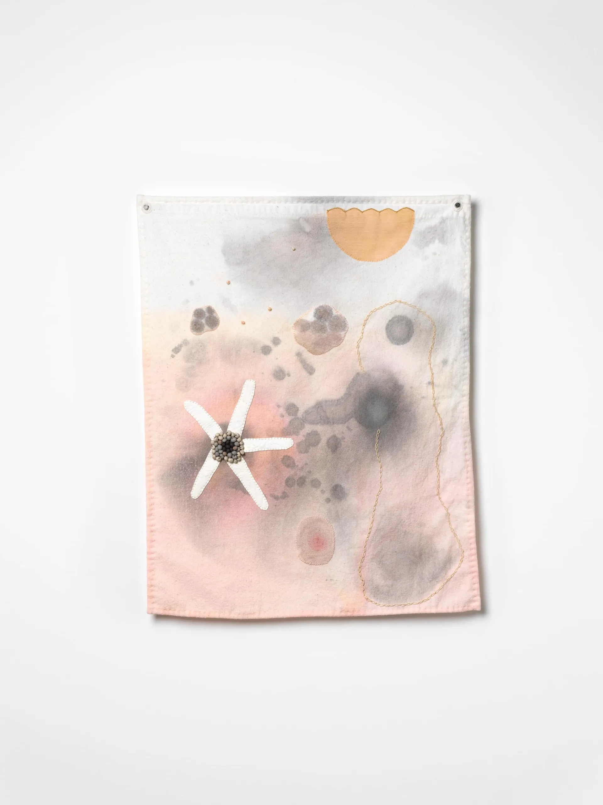 Cotton, leather glove, repurposed threads, handmade beads, hand-dyed negligee, hand-stained flannelette