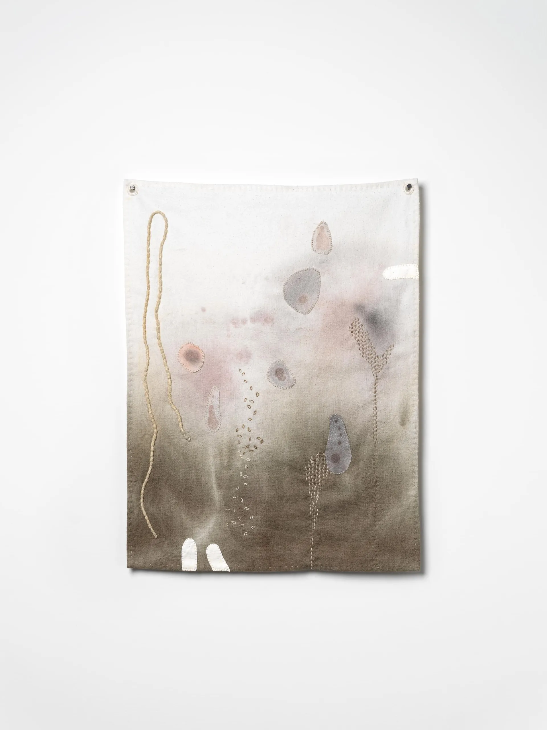 Cotton, leather glove, repurposed threads, shoelace, hand-stained flannelette