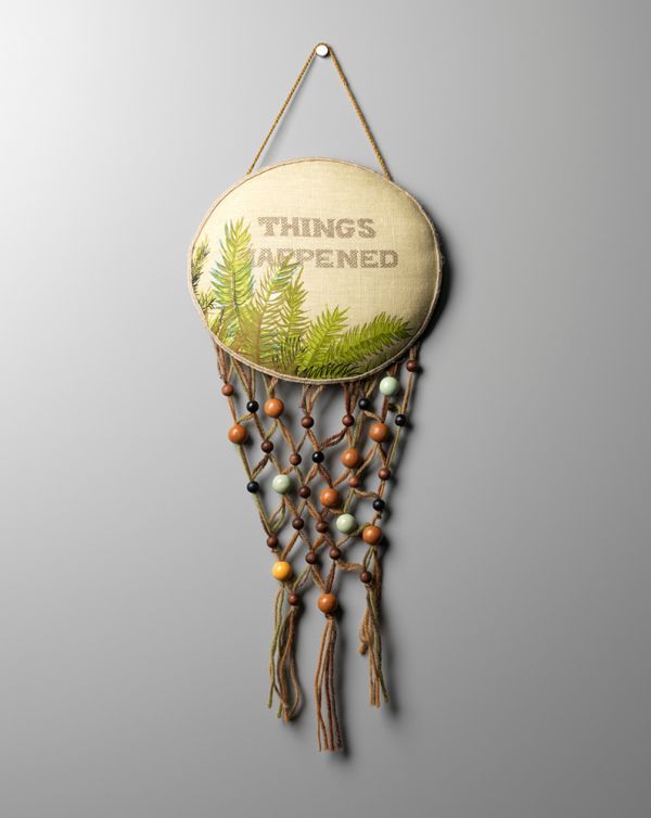 2010, card, linen teatowel, cotton, wooden beads, trim, stuffing